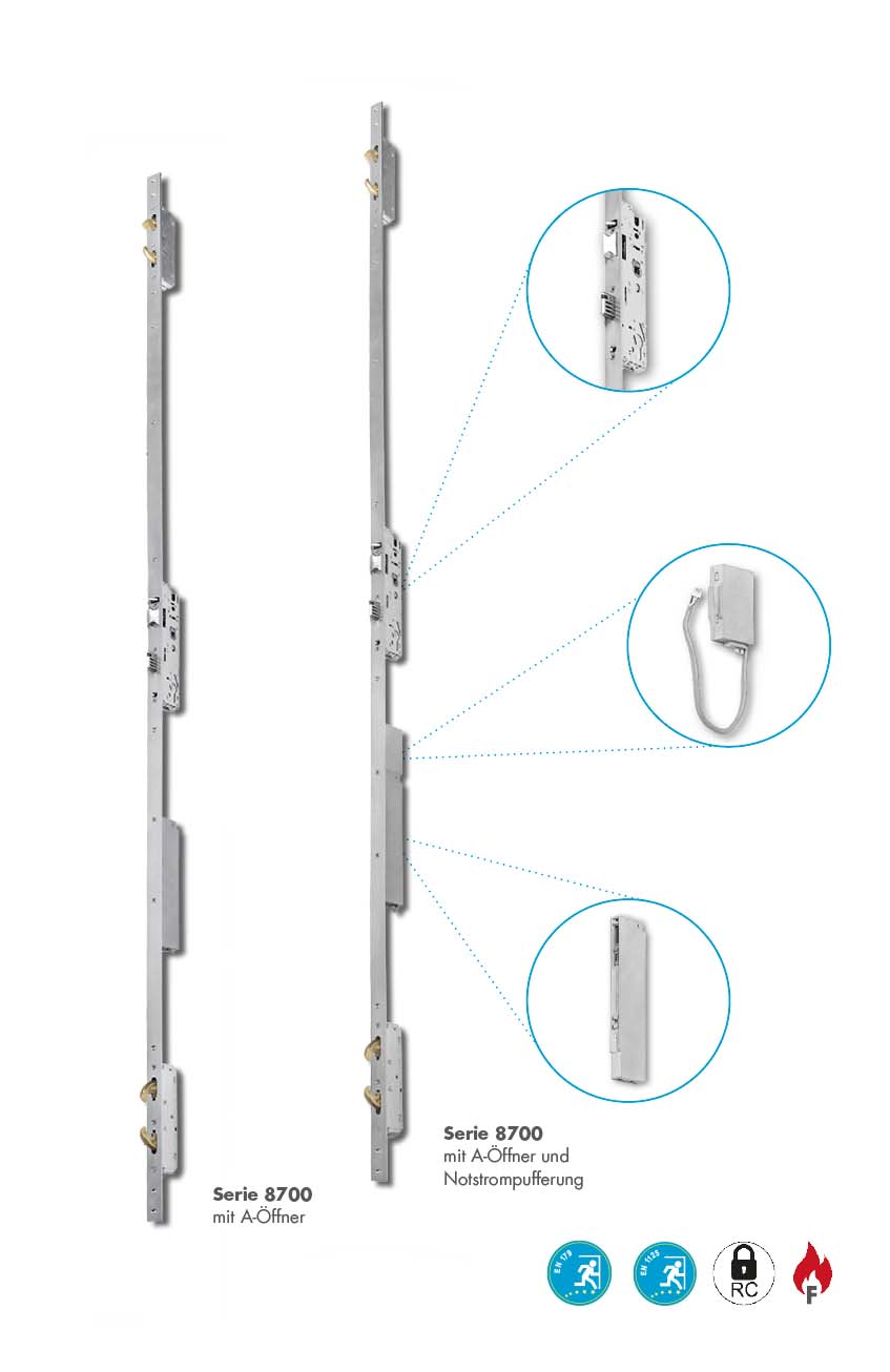 Met de nieuwe meerpuntssloten met vluchtdeurfunctie van de 8000-serie completeert WILKA zijn aanbod op het gebied van profieldeuren (aluminium en staal) voor enkelvoudige en meerpuntssloten bij een- of tweevleugelige vluchtdeuren. De productserie bestaat enerzijds uit sleutelbediende meerpuntssloten met vluchtdeurfunctie, de 8600-serie en anderzijds uit de zelfvergrendelende variant: de 8700-serie.